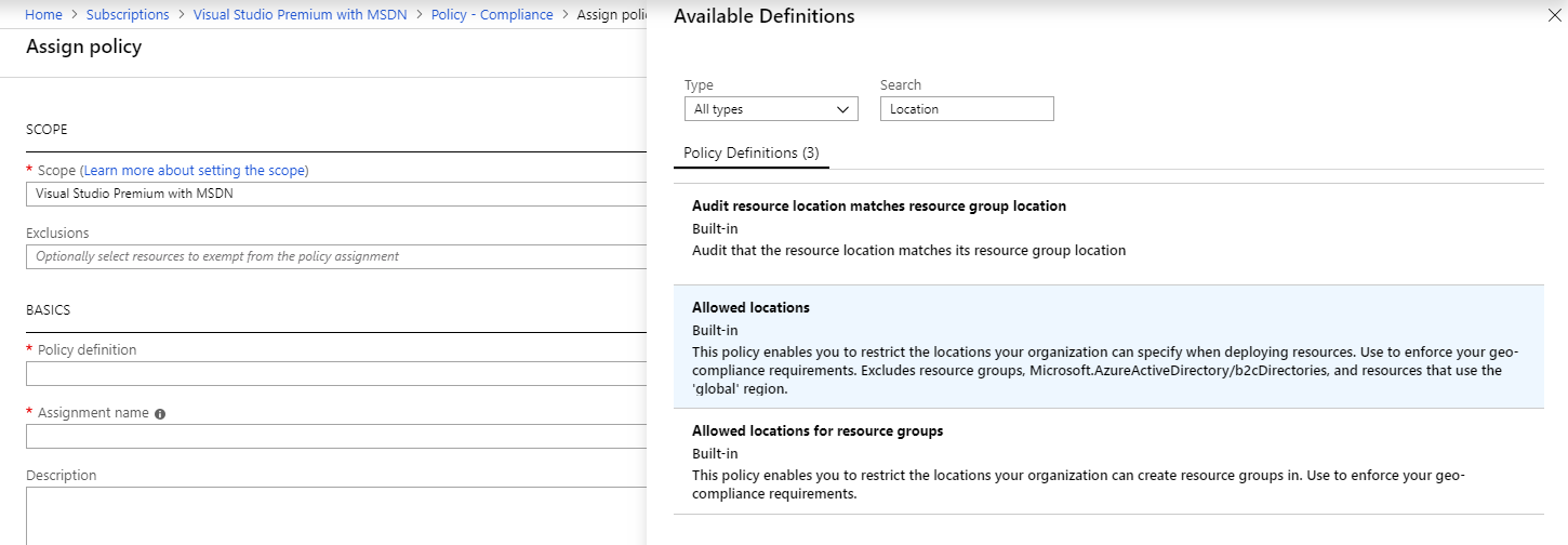 This will open the Compliance blade within the policy settings. Now click “Assign policy” and select the appropriate policy definition, searching for “Location” will filter the list down to find the “Allowed locations” policy: