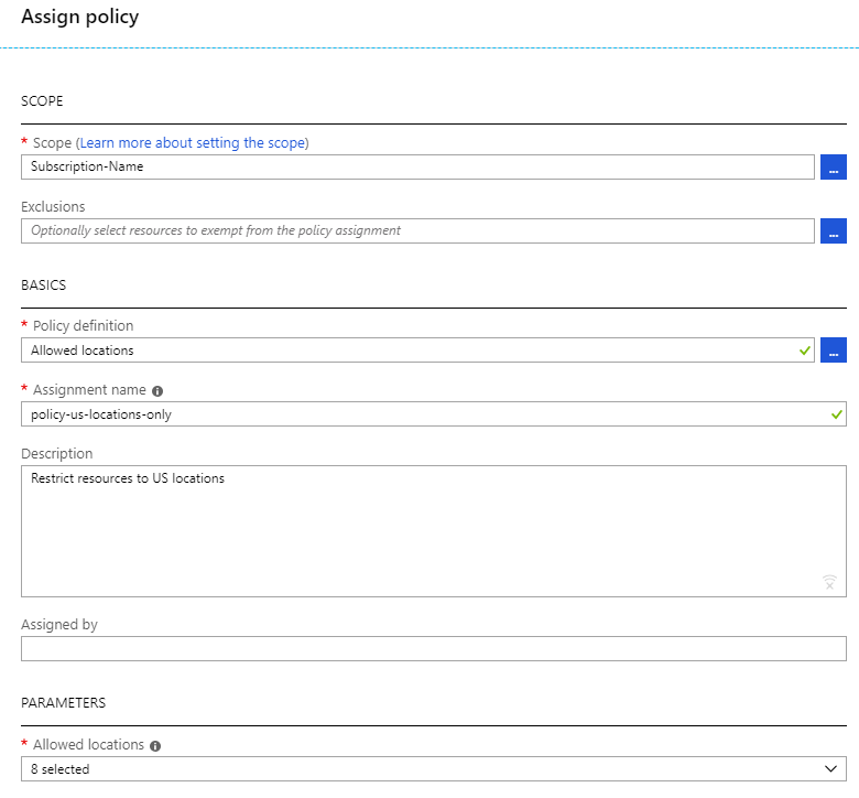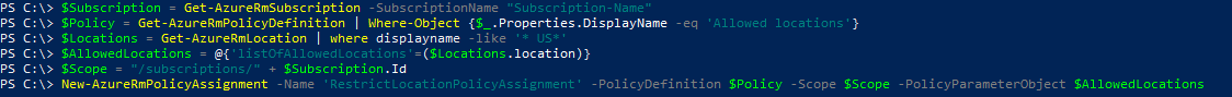 PS C:\> $Subscription = Get-AzureRmSubscription -SubscriptionName "Subscription-Name" PS C:\> $Policy = Get-AzureRmPolicyDefinition | Where-Object {$_.Properties.DisplayName -eq 'Allowed locations'} PS C:\> $Locations = Get-AzureRmLocation | where displayname -like '* US*’ PS C:\> $AllowedLocations = @{'listOfAllowedLocations'=($Locations.location)} PS C:\> $Scope = "/subscriptions/" + $Subscription.Id PS C:\> New-AzureRmPolicyAssignment -Name 'RestrictLocationPolicyAssignment' -PolicyDefinition $Policy -Scope $Scope -PolicyParameterObject $AllowedLocations
