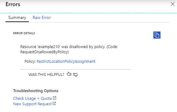 {"code":"InvalidTemplateDeployment","message":"The template deployment failed with multiple errors. Please see details for more information.","details":[{"code":"RequestDisallowedByPolicy","target":"example210","message":"Resource 'example210' was disallowed by policy. (Code: RequestDisallowedByPolicy)","additionalInfo":[{"type":"PolicyViolation","info":{"policyDefinitionDisplayName":"Allowed locations","evaluationDetails":{"evaluatedExpressions":[{"result":"True","expression":"location","path":"location","expressionValue":"northeurope","targetValue":["centralus","eastus","eastus2","westus","northcentralus","southcentralus","westcentralus","westus2"],"operator":"NotIn"},{"result":"True","expression":"location","path":"location","expressionValue":"northeurope","targetValue":"global","operator":"NotEquals"},{"result":"True","expression":"type","path":"type","expressionValue":"Microsoft.Network/networkInterfaces","targetValue":"Microsoft.AzureActiveDirectory/b2cDirectories","operator":"NotEquals"}]},"policyDefinitionId":"/providers/Microsoft.Authorization/policyDefinitions/e56962a6-4747-49cd-b67b-bf8b01975c4c","policyDefinitionName":"e56962a6-4747-49cd-b67b-bf8b01975c4c","policyDefinitionEffect":"deny","policyAssignmentId":"/subscriptions/e58f54c7-5174-4214-b458-25c5b378fc96/providers/Microsoft.Authorization/policyAssignments/RestrictLocationPolicyAssignment","policyAssignmentName":"RestrictLocationPolicyAssignment","policyAssignmentScope":"/subscriptions/e58f54c7-5174-4214-b458-25c5b378fc96","policyAssignmentSku":{"name":"A0","tier":"Free"},"policyAssignmentParameters":{"listOfAllowedLocations":{"value":["centralus","eastus","eastus2","westus","northcentralus","southcentralus","westcentralus","westus2"]}}}}],"policyDetails":[{"isInitiative":false,"assignmentId":"/subscriptions/e58f54c7-5174-4214-b458-25c5b378fc96/providers/Microsoft.Authorization/policyAssignments/RestrictLocationPolicyAssignment","assignmentName":"RestrictLocationPolicyAssignment","viewDetailsUri":"https://portal.azure.com#blade/Microsoft_Azure_Policy/EditAssignmentBlade/id/%2Fsubscriptions%2Fe58f54c7-5174-4214-b458-25c5b378fc96%2Fproviders%2FMicrosoft.Authorization%2FpolicyAssignments%2FRestrictLocationPolicyAssignment"}]}]}