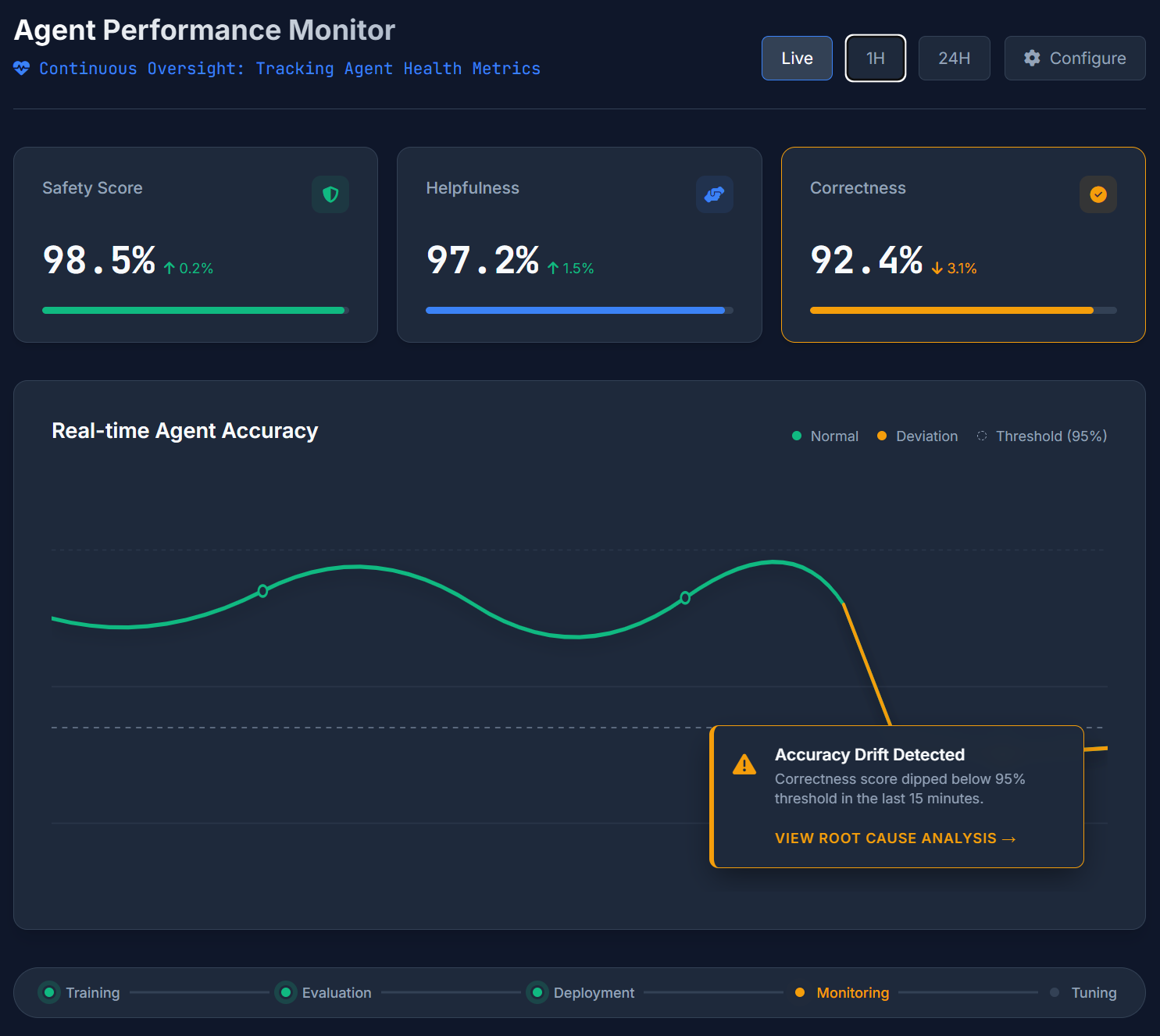 This shifts agent oversight from manual spot-checks to an actual DevOps lifecycle. You get alerting when agent behavior regresses, tracking of evaluation metrics over time, and the ability to catch problems before they compound into incidents. It's the difference between hoping your agent still works correctly and knowing it does.
