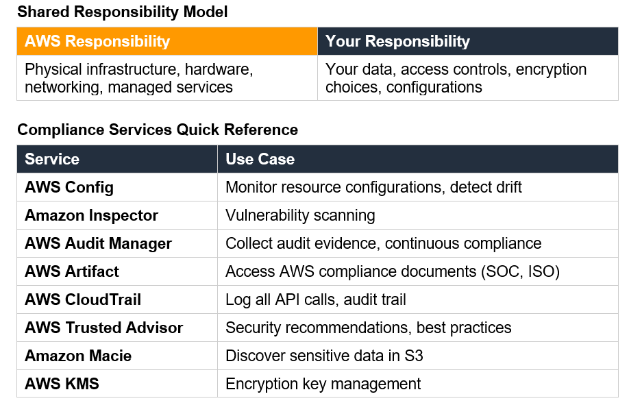 Good news: the exam is not asking you to become a compliance attorney. You just need to know that these frameworks exist, what they broadly cover, and which AWS tool hands you the relevant paperwork when an auditor comes knocking.