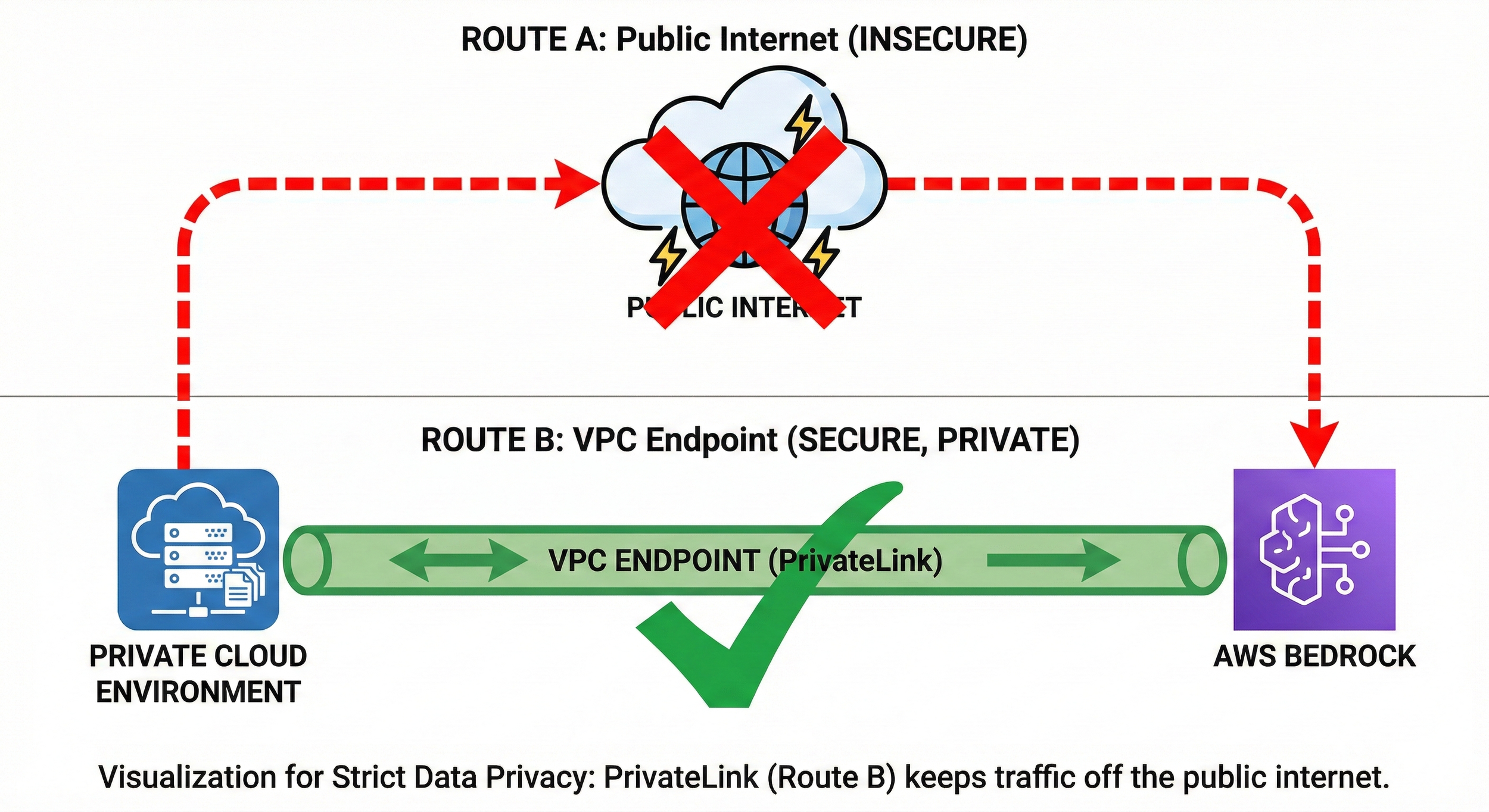 By default, when your application calls an AWS AI service, traffic goes over the public internet (encrypted, but still public). For sensitive workloads, you want traffic to stay on the AWS network.