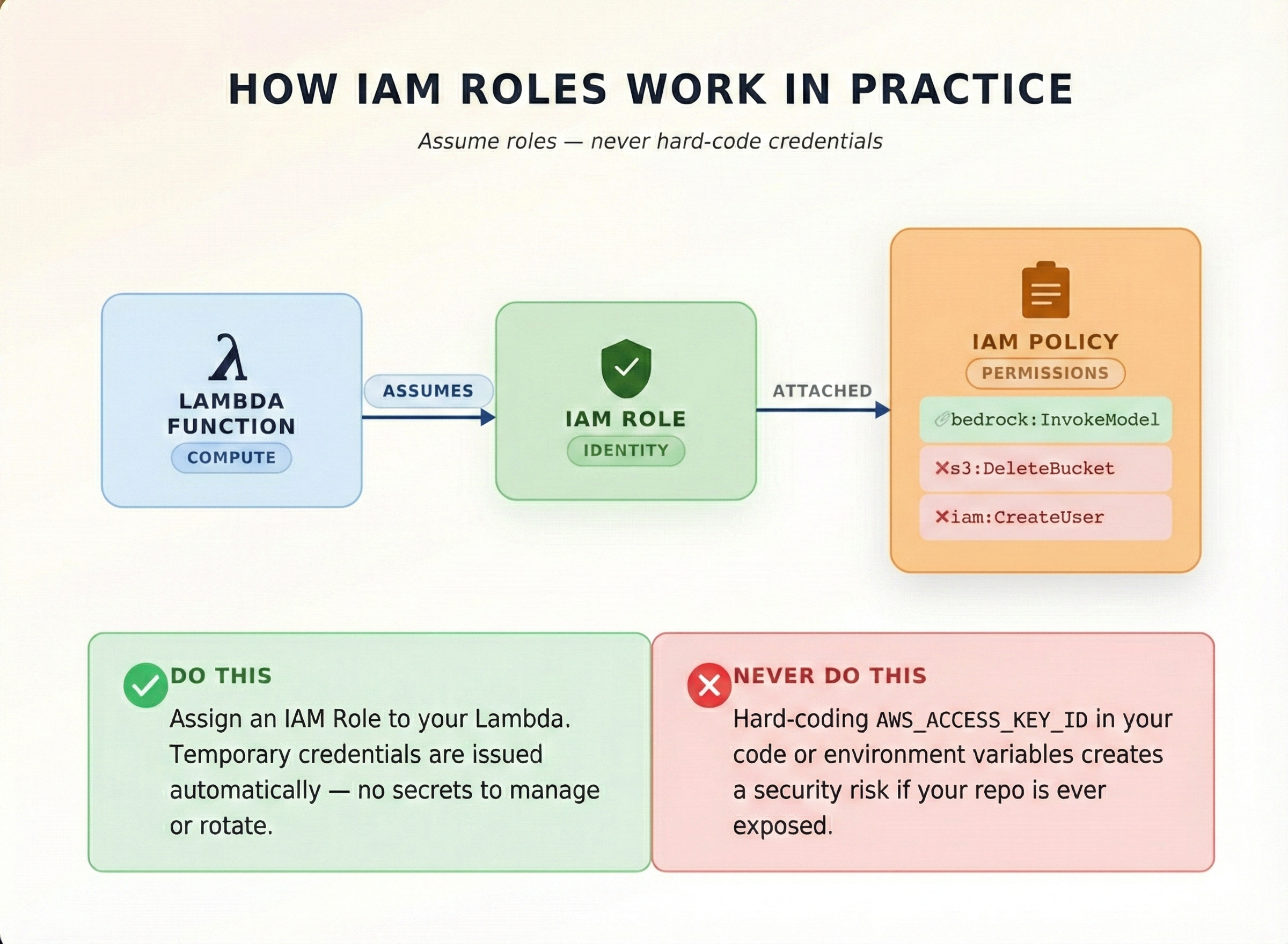IAM Roles: These are temporary hats that users or services can wear. Hard-coding passwords is a huge no-no (please don’t do this in any environment!). A Lambda function calling Bedrock assumes a role with specific permissions instead.