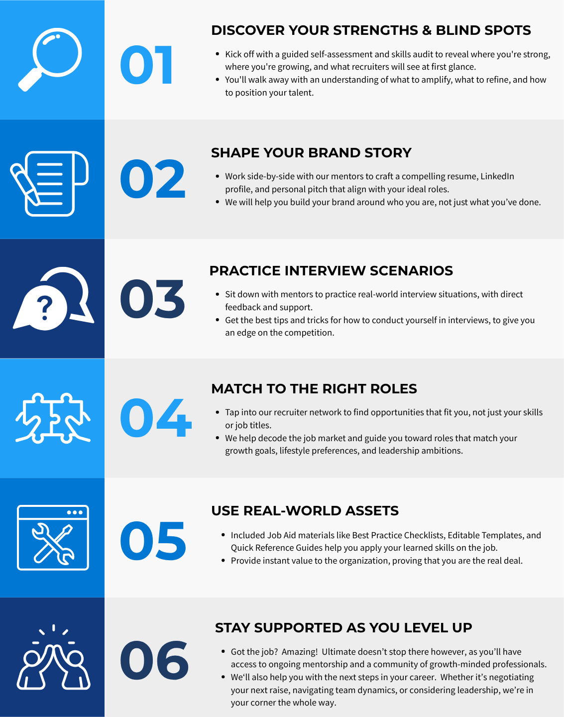 Transform your ambition into action. With 1:1 support, personalized training plans, resume and interview coaching, and hands-on guidance from a dedicated recruiter partner, you’ll be equipped for rapid job placement. The Ultimate Plan is your all-access pass to expert tools, best practice playbooks, and an exclusive community laser-focused on success.